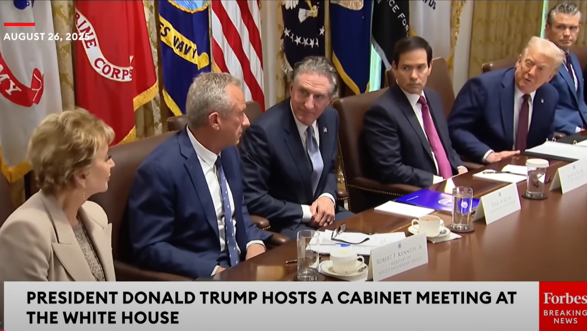 在上個月的內閣會議上,特朗普要求美國教育部長麥克馬洪(左一)狠狠教訓哈佛 視頻截圖