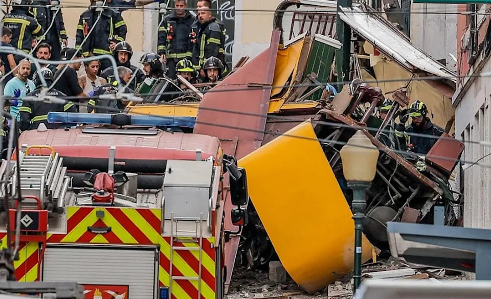 現場畫面顯示,一輛黃色纜車已損毀,該纜車原本負責在里斯本一處陡峭山坡上接送乘客上下山,緊急救援人員正從殘骸中搜救被困人員。