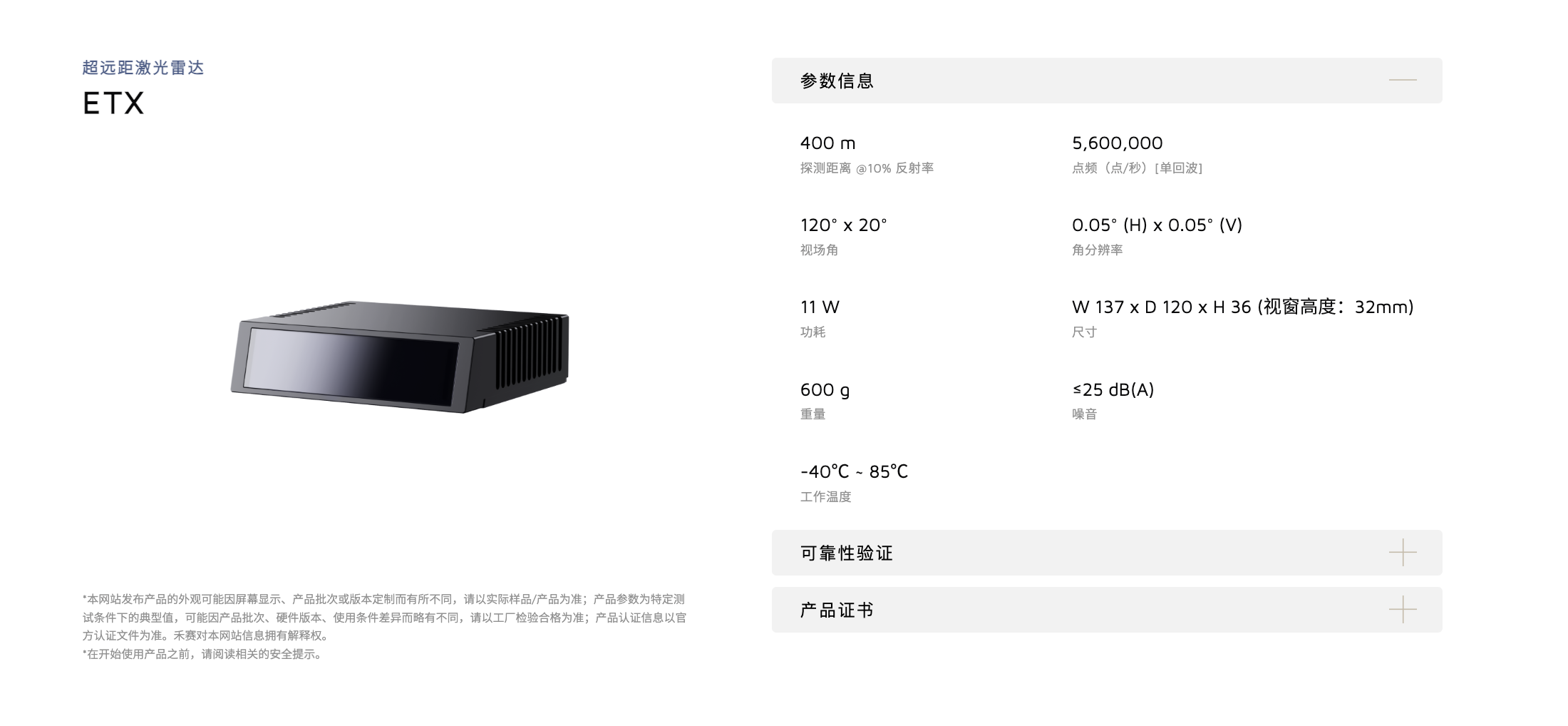 ETX超遠距激光雷達關鍵參數 禾賽科技