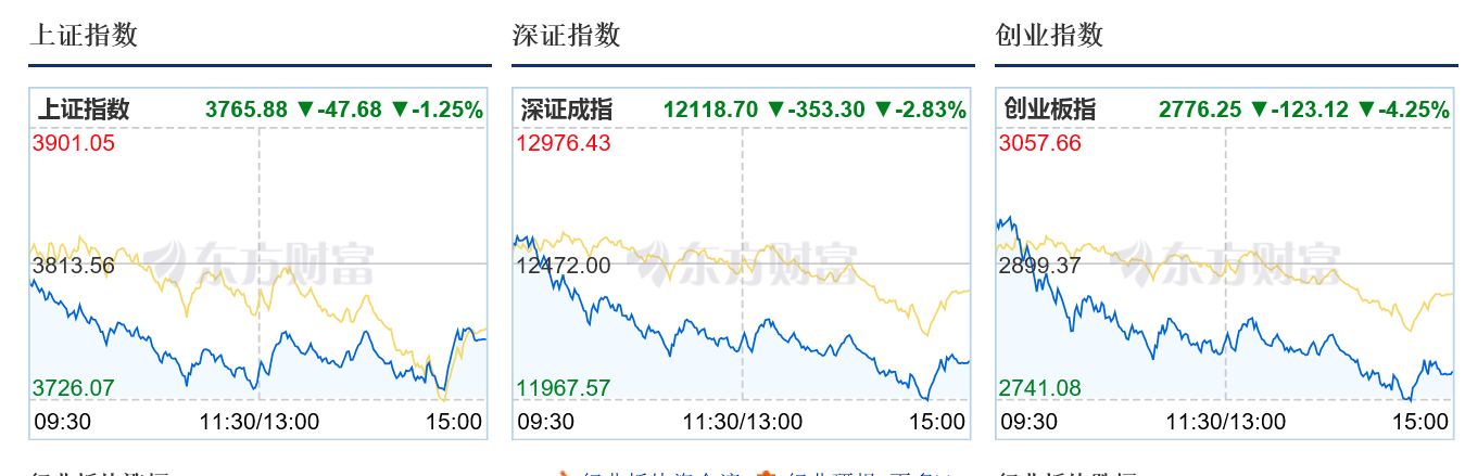 從整體行情來看,A股三大指數全線下跌,創業板指領跌。上證指數跌1.25%,報3765.88,;深證成指跌2.83%,報12118.7;創業板指跌4.25%,報2776.25。從板塊來看,商業百貨、美容護理、食品飲料、旅遊酒店等大消費板塊漲幅居前,算力硬件股、稀土永磁、軍工板塊等板塊跌幅居前。滬深兩市成交額約25442.57億元,較前一個交易日放量約1801.71億元。全市場2297只股票上漲、2990只股票下跌,其中43只漲停、47只跌停。