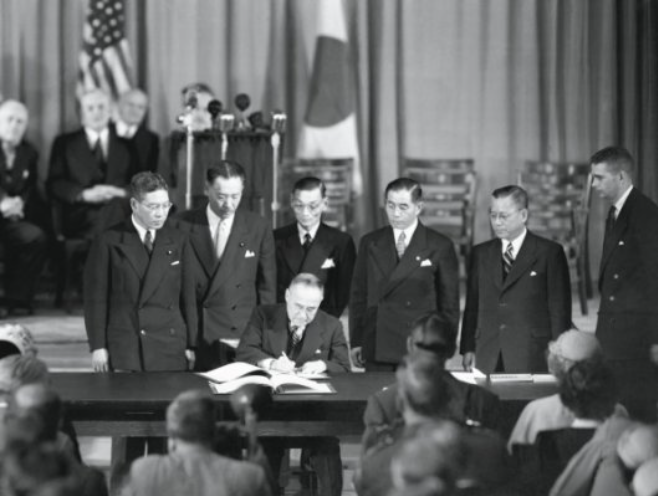 1951年9月8日,《舊金山和約》簽字儀式的傍晚,日本時任首相吉田茂(中)與美國又簽署了《日美安保條約》