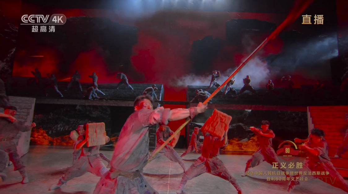 這場演出還有一個讓我很感動的點,那就是過去表現抗日戰爭,人們總有種思維慣式,認為是日本侵略我們,他們進攻,我們防禦。大量的抗戰電影和影視作品都會着重表現防禦作戰的慘烈,巔峯之作就是《血戰台兒莊》。這是一個典型的例子,講述我們抵抗敵人,一寸江山一寸血,10萬青年10萬兵。但我們説,抗日戰爭的本質是一場反侵略戰爭啊,它的目標是消滅敵人,我們其實應該用更具有殺傷力的表現形式,甚至採取進攻的形式來表現。