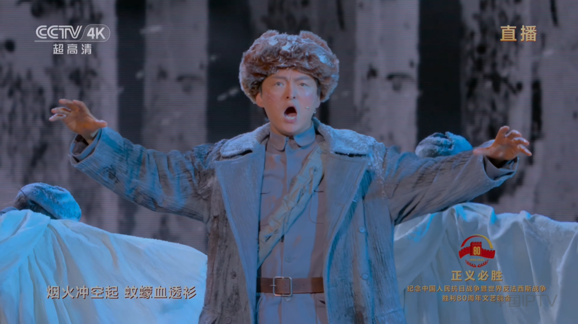 **冬曉:**這裏就必須提到本次文藝匯演最大的亮點,那就是中國的革命敍事再一次被帶回主流視野。過去有那麼一段時間,基於兩岸關係等考慮,我們對於國共雙方在抗日戰爭中扮演的角色是不太去提的。我小時候的歷史課還講,中國共產黨在抗日戰爭中起到了中流砥柱的作用,電視上播電視劇是《八路軍》,電影是《太行山上》,可到了2010年之後,公共輿論場上就幾乎不怎麼提了,取而代之的是電視劇《戰長沙》,電影《八佰》,文藝圈開始颳起一股“矯枉過正”的風氣。