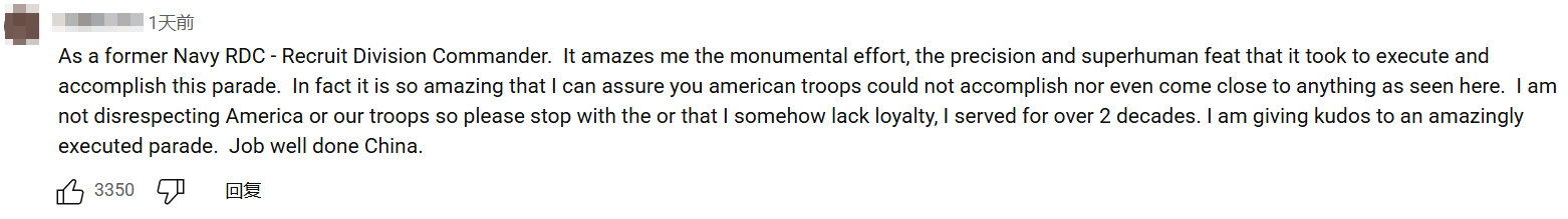一名美國網友表示自己是“前美國海軍新兵訓練營指揮官”,他認為“此次閲兵的組織執行所付出的巨大努力、展現的精準水準與近乎超人的壯舉,令我深感震撼。事實上,其精彩程度足以讓我斷言:美軍根本無法完成這樣的閲兵,甚至連與之接近的水平都達不到”。