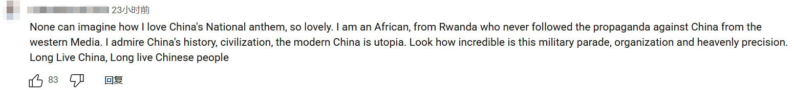 一名盧旺達網友評論:“沒人能想象我有多愛中國國歌,它太動聽了。我是一名非洲人,來自盧旺達,從未被西方媒體那些抹黑中國的宣傳所影響。我欽佩中國的歷史與文明,如今的中國就像一個理想國度。看看這場閲兵——組織安排周密有序,動作精準得令人驚歎。中國萬歲,中國人民萬歲!”