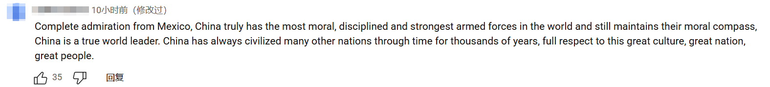 來自墨西哥的一位網友也表示“由衷敬佩”:“中國擁有世界上最具道德感、紀律最嚴明且實力最強大的武裝力量,同時始終堅守道德準則,中國是真正的世界領導者。數千年來,中國一直以自身的文明影響着眾多國家。我向這個偉大的文化、偉大的國家以及偉大的人民致以最崇高的敬意。”