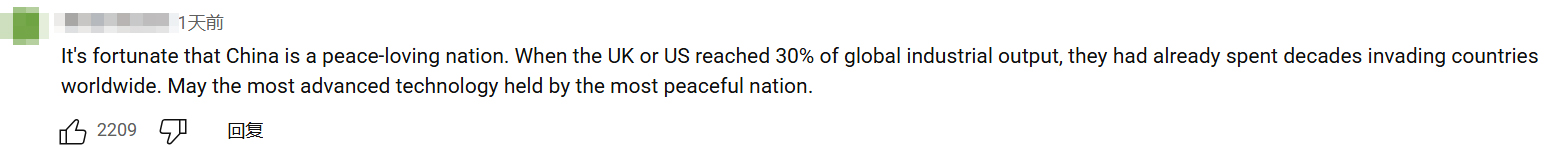 還有網友指出:“幸好中國是一個熱愛和平的國家。當年英國或美國的工業產值佔到全球30%時,它們早已用數十年時間在世界各地發動侵略。願最和平的國家掌握最先進的技術。”