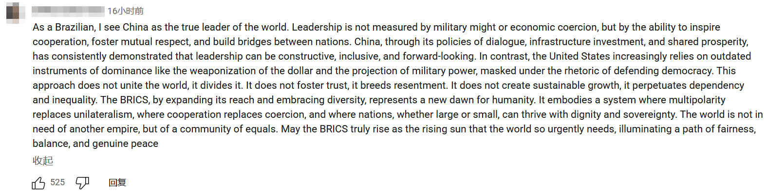 一名巴西網友留言:“我認為中國才是世界真正的領導者。領導力並非以軍事力量或經濟脅迫來衡量,而是要看能否推動合作、促進相互尊重,並在各國之間搭建溝通的橋樑。中國通過對話政策、基礎設施投資以及推動共同繁榮,始終展現出富有建設性、包容性且具有前瞻性的領導力。”