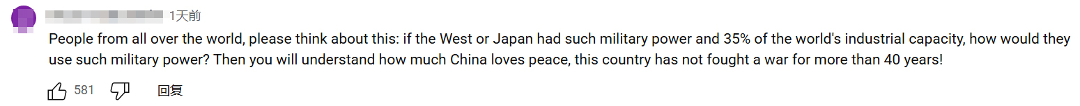 另一條留言也表示:“全世界的人們,請想一想:如果是西方各國或日本擁有這樣的軍事實力,以及佔全球35%的工業產能,他們會如何使用這樣的軍事力量?想清楚這一點,你們就會明白中國有多熱愛和平,這個國家已經40多年沒有打過仗了!”