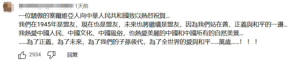 一名塞爾維亞網友表示:“一位驕傲的塞爾維亞人向中華人民共和國致以熱烈祝賀,我們在1945年是盟友,現在也是盟友,未來也將繼續是盟友,因為我們站在善、正義與和平的一邊。我熱愛中國人民、中國文化、中國風俗,也熱愛美麗的中國和中國所有的自然美景。為了正義,為了未來,為了我們的子孫後代,為了全世界的愛與和平,萬歲!!!”