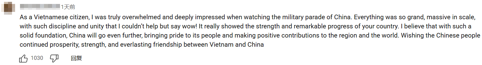 越南網友也寫道:“作為一名越南公民,我在觀看中國的閲兵儀式時,內心受到了極大觸動,也留下了深刻印象。閲兵場面宏偉壯觀、規模宏大,隊伍紀律嚴明、團結一心,我不禁為之驚歎!這充分展現了貴國的實力與非凡的發展成就。我相信,憑藉如此堅實的基礎,中國必將邁向更高的發展階段,為中國人民帶來驕傲,也為地區和世界作出積極貢獻。祝願中國人民生活持續繁榮、國家日益強盛,也祝願越中兩國友誼長存!”