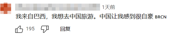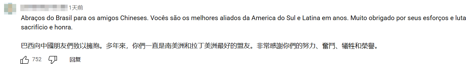 還有來自巴西的網友表示:“巴西向中國朋友們致以擁抱。多年來,你們一直是南美洲和拉丁美洲最好的盟友。非常感謝你們的努力、奮鬥、犧牲和榮譽。”還有一名巴西網友表示:“我來自巴西,我想去中國旅遊。中國讓我感到很自豪。”