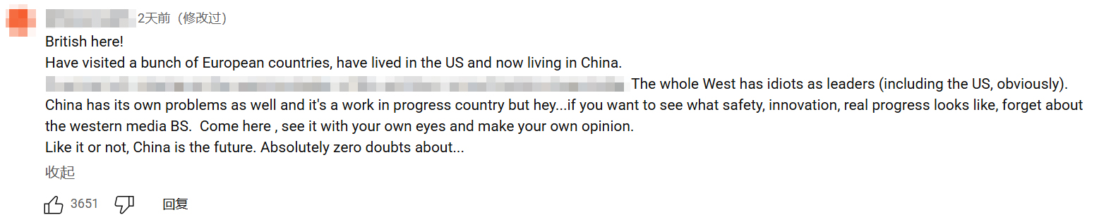英國網友評論:“我去過不少歐洲國家,在美國生活過,現在定居中國。整個西方世界的領導人都不怎麼樣(顯然,美國也包括在內)……如果你想看看什麼是安全、什麼是創新、什麼是真正的發展進步,別再信西方媒體那些胡扯了。親自來中國看看吧,用自己的眼睛去觀察,然後形成自己的判斷。不管你願不願意承認,中國就是未來。對此,我沒有絲毫懷疑。”