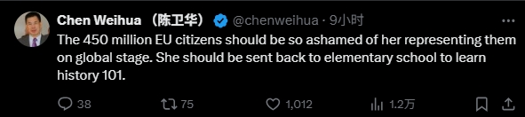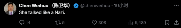 中國日報社歐盟分社社長陳衞華連發多文抨擊卡拉斯:她像納粹一樣發言;4.5億歐盟公民應該為她在全球舞台上代表他們而感到羞恥;她應該被送回小學去學習歷史……