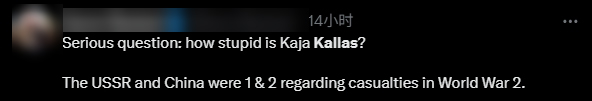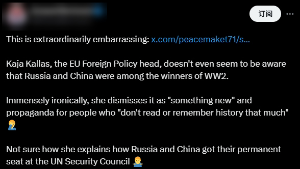 “這真是太尷尬了,”有網民寫道,“卡拉斯似乎甚至沒有意識到俄羅斯和中國是二戰的勝利者之一……實在搞不清楚她如何解釋中俄是聯合國安理會常任理事國。”