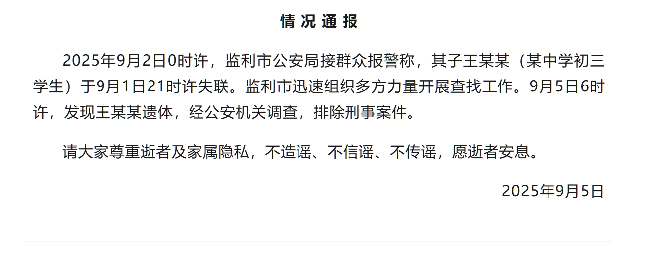 9月5日晚間,微信公眾號“監利發佈”通報稱:9月2日0時許,湖北省監利市公安局接羣眾報警稱,其子王某某(某中學初三學生)於9月1日21時許失聯。監利市迅速組織多方力量開展查找工作。9月5日6時許,發現王某某遺體,經公安機關調查,排除刑事案件。