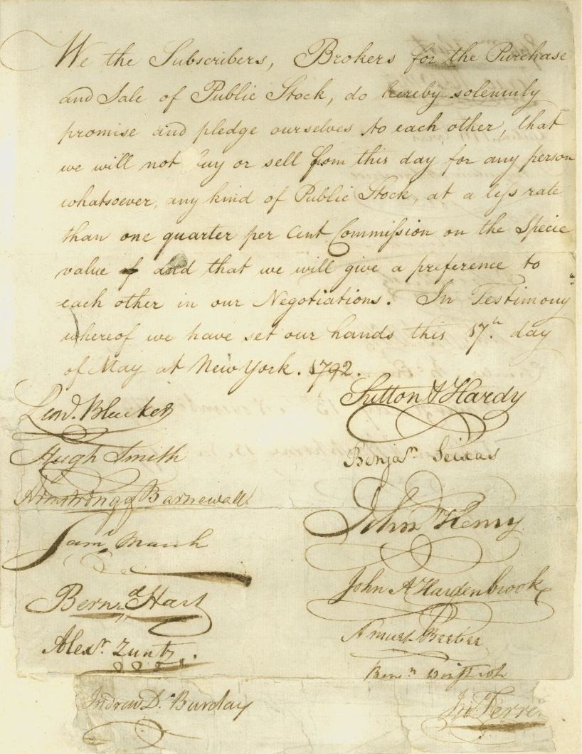 簽署協議的24位經紀人是當時成功富裕的經紀人,他們希望與有經驗、有資金的人交易,最初在唐提咖啡屋(Tontine Coffee House)進行內部交易。1812年戰爭爆發後,聯邦證券發行量急劇增加,交易量上升,經紀人們決定成立更正式的組織——紐約證券和交易委員會——以應對新狀況。