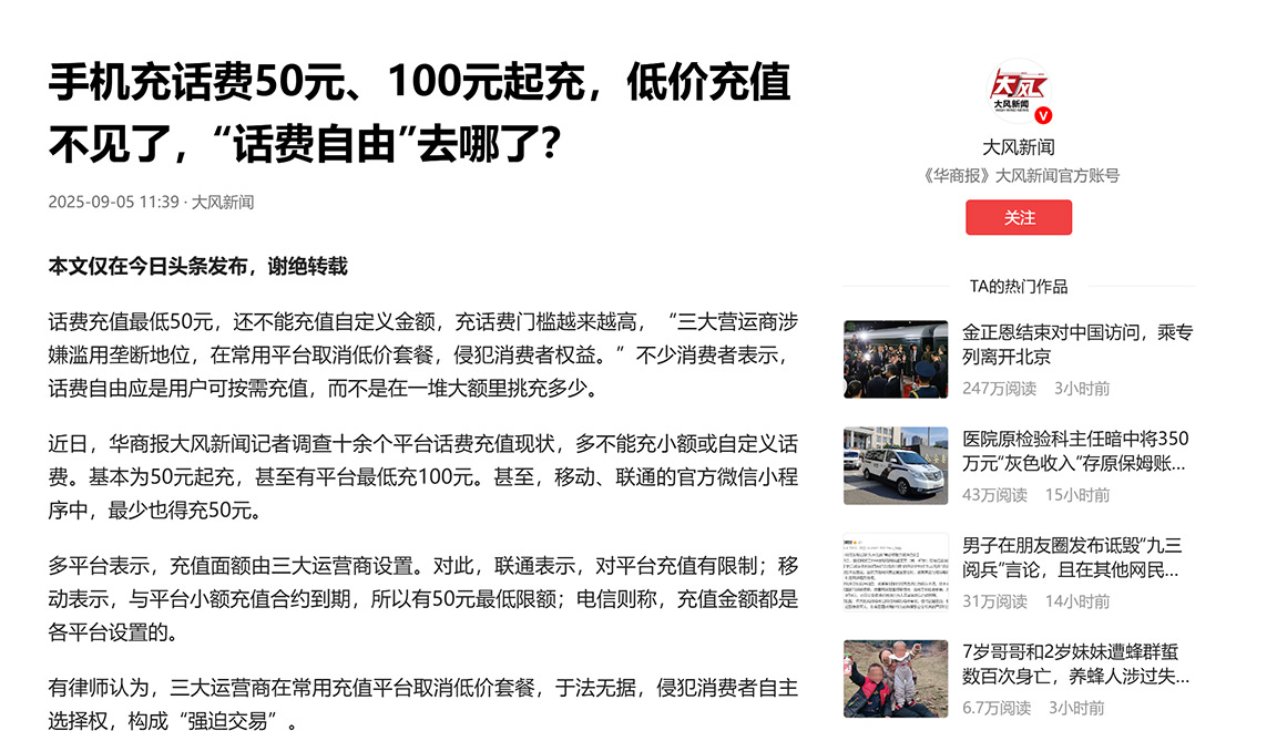 守住“話費自由”,其實並不難。運營商與平台完全可以在保留高額檔位的同時,繼續提供10元、20元的基礎選項,讓有需求的羣體能按需選擇。這樣的安排能體現對消費者的尊重,也符合數字時代普惠服務的方向。