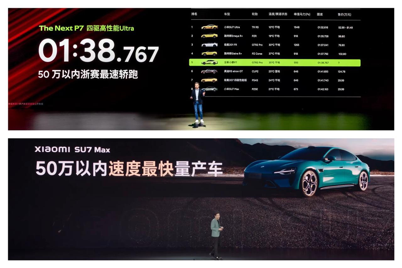 此外,為了展現產品在操控性上的良好表現,雷軍將SU7 Ultra的德國紐博格林賽道的圈速成績作為宣傳的重心,而何小鵬則在發佈會重點介紹了全新小鵬P7在浙江國際賽車場的圈速成績。