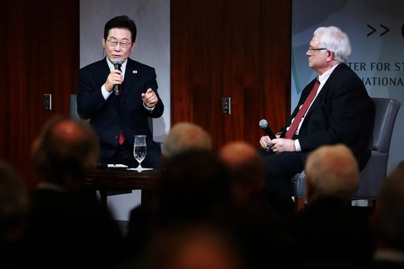 當地時間8月25日,在華盛頓的美國戰略與國際問題研究中心(CSIS),李在明回答CSIS總裁約翰·哈姆雷(John J. Hamre)的提問。 韓聯社