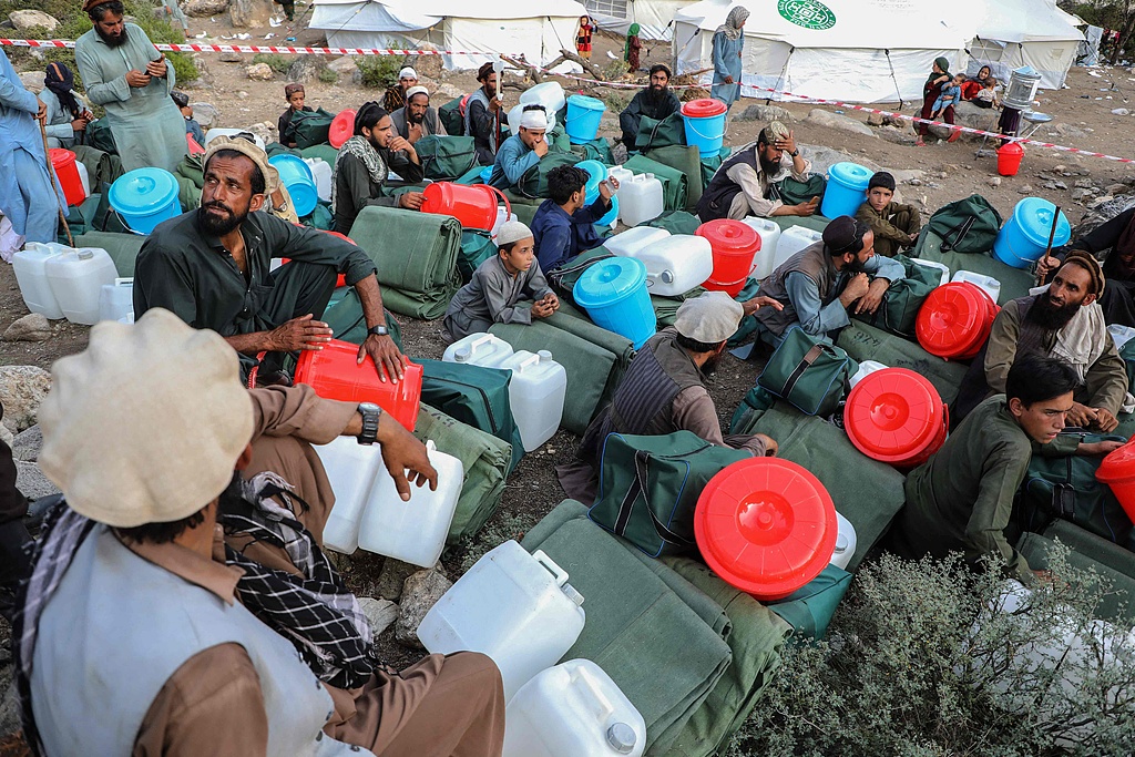 當地時間9月5日,阿富汗庫納爾省薩烏凱區德瓦古爾山谷,受地震影響的民眾正在接收阿迦汗發展網絡(AKDN)分發的救援物資。視覺中國
