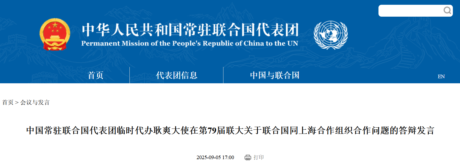 據中國常駐聯合國代表團網站9月5日消息,當天下午,第79屆聯合國大會高票通過中國主提的“聯合國同上海合作組織的合作”決議。包括上合組織所有成員國在內的近40國參與共提決議。自2009年起,聯大連續多年協商一致通過關於聯合國與上合組織合作的決議。但在9月5日的會議上,美國代表團卻要求對有關決議草案進行表決。針對美國在發言中對上合組織的無端指責,中國常駐聯合國代表團代辦耿爽大使表示堅決反對。