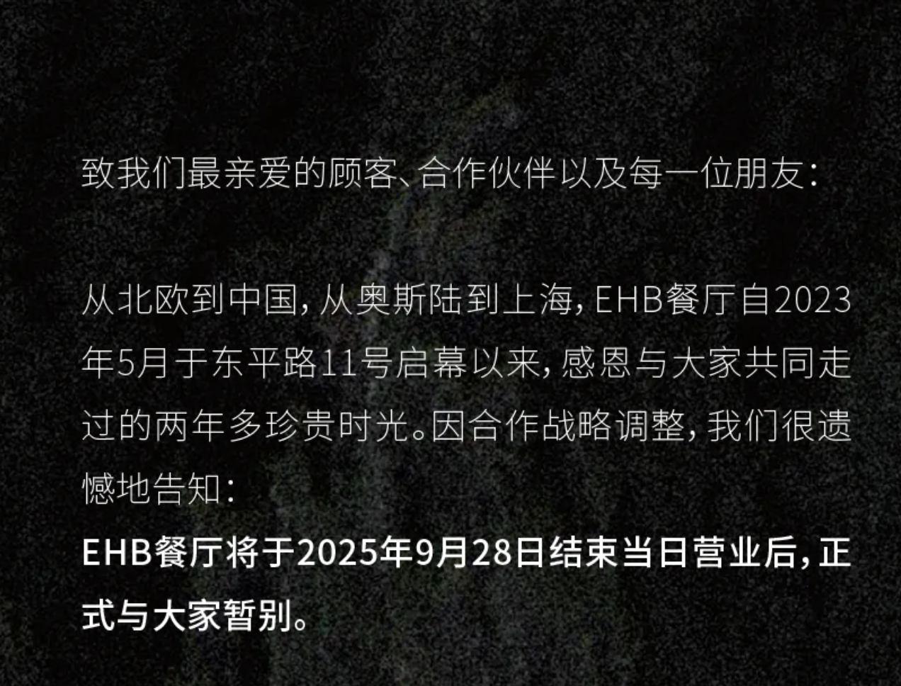 近日,EHB餐廳發文稱將與大家暫別,“從北歐到中國,從奧斯陸到上海,EHB餐廳自2023年5月於東平路11號啓幕以來,感恩與大家共同走過的兩年多珍貴時光。因合作戰略調整,我們很遺憾地告知:EHB餐廳將於2025年9月28日結束當日營業後,正式與大家暫別。”