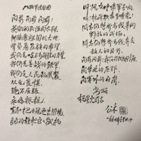 當我們回溯抗戰時期的軍歌《八路軍進行曲》,其作詞者公木當時只有26歲。這首《八路軍進行曲》,如今是《中國人民解放軍軍歌》。根據條令條例規定,在迎送軍旗等重大場合,都要奏唱《中國人民解放軍軍歌》。每每聽到這首歌,我常常熱淚盈眶。