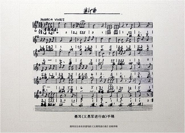 當時聶耳才23歲,經田漢介紹已經加入中國共產黨,他主動要求為這首歌作曲。據友人回憶,在創作《義勇軍進行曲》時,他幾乎廢寢忘食,夜以繼日,一會兒在桌子上打拍子,一會兒坐在鋼琴前彈琴,一會兒在樓板上不停走動,一會兒又高聲地唱起來。為了使歌曲更加流暢,他對歌詞做了小小的修改。田漢的原文是“我們萬眾一心,冒着敵人的大炮飛機前進”,修改成了“我們萬眾一心,冒着敵人的炮火前進,前進,前進進”。