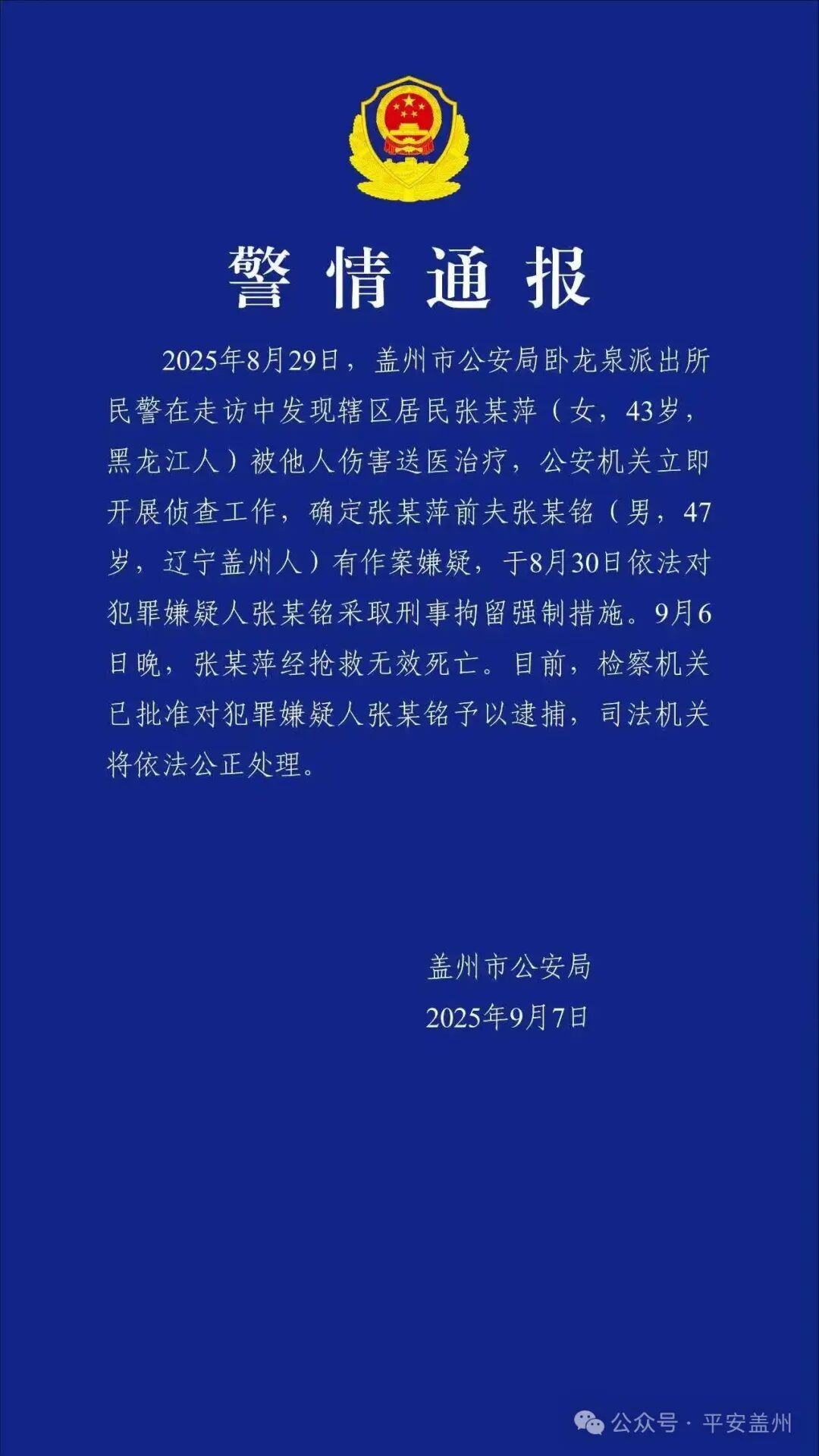 2025年8月29日,蓋州市公安局卧龍泉派出所民警在走訪中發現轄區居民張某萍(女,43歲,黑龍江人)被他人傷害送醫治療,公安機關立即開展偵查工作,確定張某萍前夫張某銘(男,47歲,遼寧蓋州人)有作案嫌疑,於8月30日依法對犯罪嫌疑人張某銘採取刑事拘留強制措施。9月6日晚,張某萍經搶救無效死亡。目前,檢察機關已批准對犯罪嫌疑人張某銘予以逮捕,司法機關將依法公正處理。