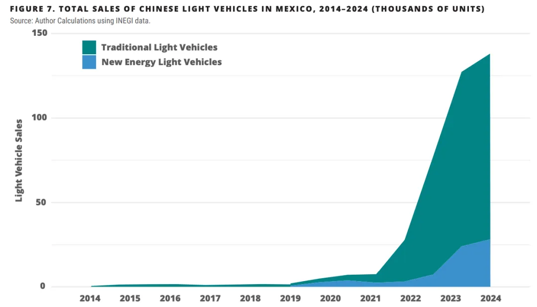 儘管中國汽車出口全球增速放緩,但墨西哥的佔比還在持續提升。2024年,墨西哥從中國進口汽車零部件127億美元,佔其自華進口總額14.1%。同年,中國在墨輕重型汽車銷量(含本土組裝)約13.8萬輛,佔墨總銷量13%;中國輕型車(轎車、SUV、皮卡車)銷量佔墨市場份額達到9.7%,較五年前0.5%的份額增幅顯著,其中進口占比很高。