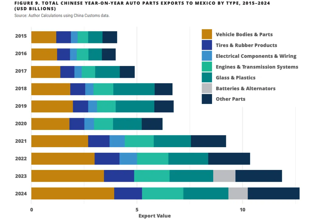 在許多情況下,中國零部件企業進入墨西哥並非追隨中國汽車製造商的步伐。中國主機廠大多直接從中國進口整車或零部件,而非依賴本土供應商。與中國主機廠類似,墨西哥境內的中國零部件企業似乎也嚴重依賴從中國進口貨物。2024年,墨西哥境內的中國汽車零部件企業從中國進口的貨物金額近20億美元。
