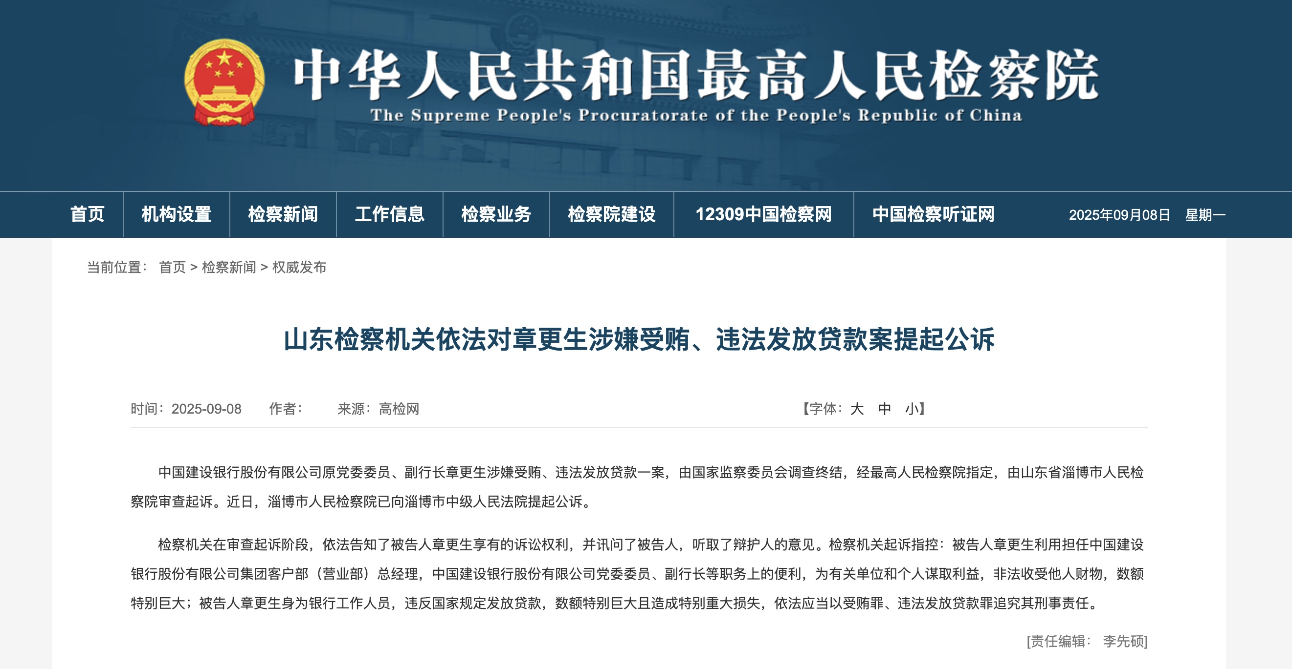 9月8日,最高人民檢察院發佈消息稱,中國建設銀行股份有限公司原黨委委員、副行長章更生涉嫌受賄、違法發放貸款一案,已由國家監察委員會調查終結,經最高人民檢察院指定管轄,山東省淄博市人民檢察院依法向淄博市中級人民法院提起公訴。檢察機關指控,章更生利用職務便利非法收受他人財物,數額特別巨大;同時違反國家規定發放貸款,造成特別重大損失,應以受賄罪、違法發放貸款罪追究其刑事責任。
