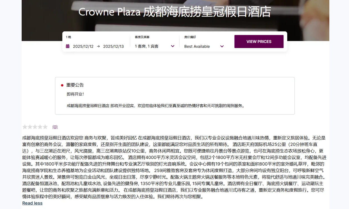 截至發文時,海底撈方面暫無回應。IHG大中華區相關人士在回應中表示:該酒店項目仍處於籌備與優化階段,部分體驗和產品尚在進一步調整中,因此不便透露更多細節;後續如有新進展或確定信息,將第一時間對外公佈;具體開業時間以官網信息為準,消費者可通過官方預訂渠道查詢——酒店信息出現在系統中即代表即將開業,若暫未開放預訂,則表明近期尚無營業計劃。