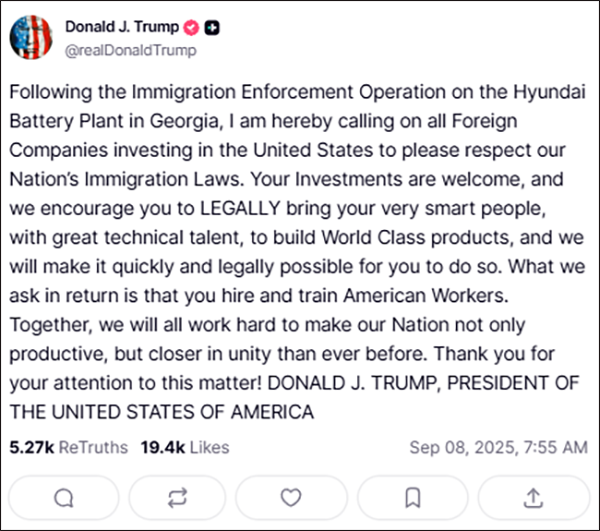 9月4日,美國移民與海關執法局(ICE)突襲檢查喬治亞州現代LG電動車工廠,共拘留475人,其中大多數為韓國國民。這是特朗普第二次上台以來,ICE在單個工廠進行的最大規模的執法行動。