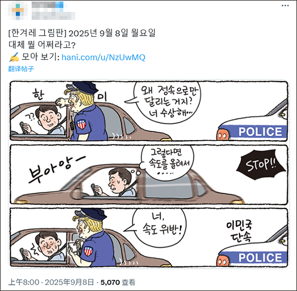 更有韓國人轉發了一幅諷刺美方執法雙標的漫畫,畫面中的美國警察神似特朗普,對駕駛者喊“你開太慢了!”駕駛者一加速,又立刻被開罰單,似乎無論怎麼開,都逃不掉“特朗普式執法”。