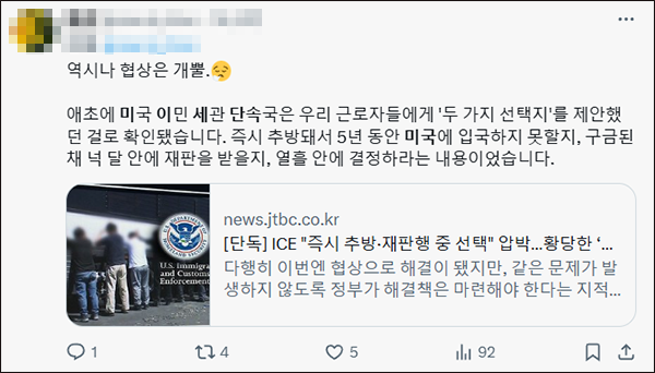 在社交媒體上,有韓國網民轉發ICE執法視頻並直接罵道,“果然,協商都是XX”。