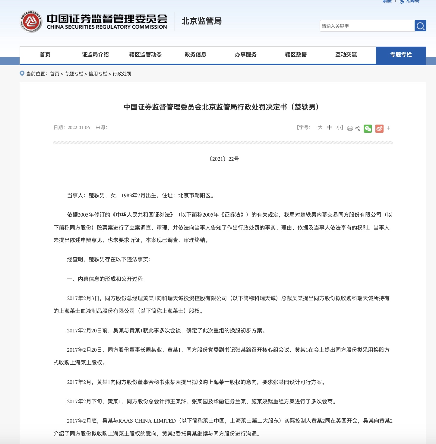 這起震驚資本市場的內幕交易案源於2017年一起龐大的併購計劃。當年2月,同方股份提出收購科瑞天誠所持上海萊士股權的計劃,交易金額接近300億元,構成重大資產重組。