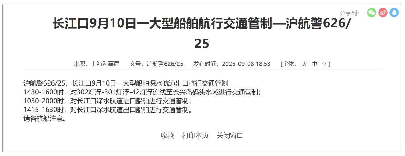 據中國海事局網站9月8日消息,上海海事局發佈滬航警626/25公告,長江口9月10日一大型船舶深水航道出口航行交通管制