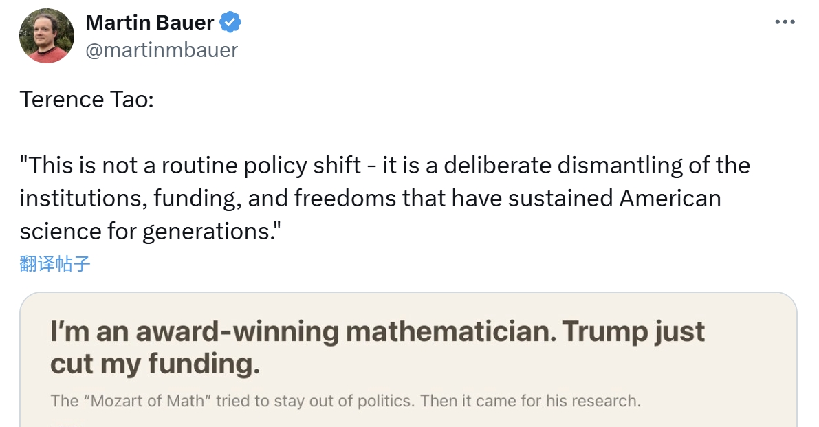 《華盛頓郵報》指出,數學與政治通常鮮有交集,但陶哲軒此次公開發聲,直指聯邦科研資金的動盪、延遲與不確定性,正危及美國獨特的科學生態系統。