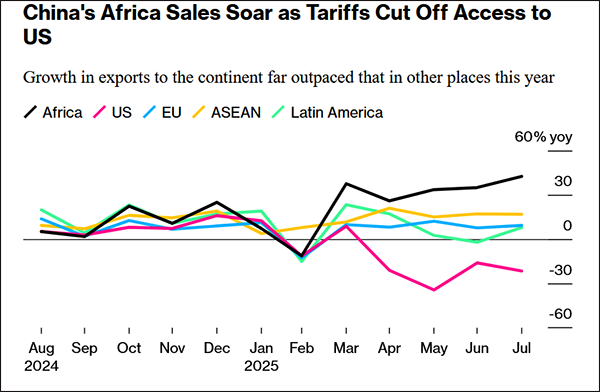另據彭博社8月26日援引數據分析報道稱,截至其發稿時,中國今年對非洲的出口已經超過2020年全年水平,出口額達到1220億美元,預計全年有望突破2000億美元,增速遠超其他主要國家,而對美出口則出現下滑,同比下降13.5%。