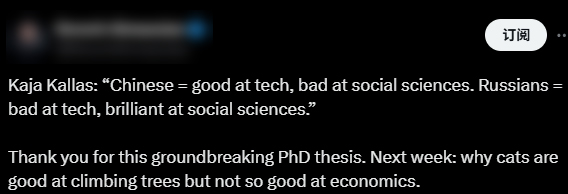 “感謝您這篇開創性的博士論文,”一名網民諷刺稱,期待卡拉斯下週繼續發表“高見”,“為什麼貓擅長爬樹,卻不太擅長經濟學”。