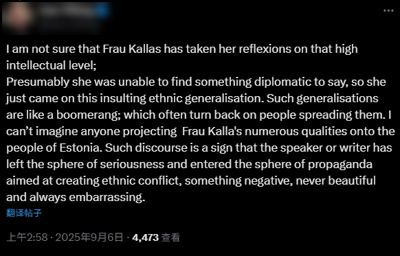 還有一名網民試圖剖析卡拉斯如此表態的背後邏輯,“大概她找不到什麼外交辭令,所以就用這種侮辱性的種族概括來搪塞”。但這名網民表示,這隻會製造衝突,總是造成“負面”“不美好”“尷尬”的影響,並警告稱,此類言論“就像迴旋鏢,往往會反彈回來,反噬散播它們的人”。