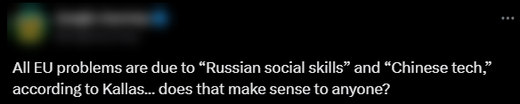 此外,卡拉斯還對中俄評頭論足。她聲稱:“你知道的,中國在科技方面非常出色,但他們在社會科學方面不太擅長。相比之下,你知道的,俄羅斯在科技方面一點也不擅長,但在社會科學方面非常出色。”