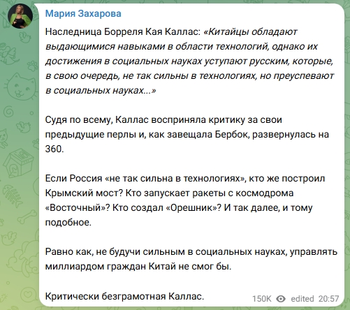 9月8日,俄羅斯外交部發言人扎哈羅娃在社交媒體“電報”上發文,嘲笑卡拉斯“無知至極”。