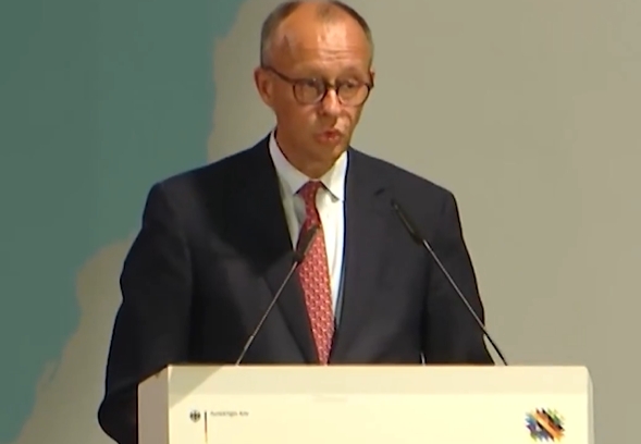 默茨8日在柏林一場活動上發表講話 視頻截圖