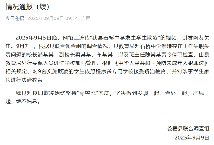 9月7日,“今日蒼梧”微信公眾號發佈蒼梧縣聯合調查組的第一份情況通報表示,蒼梧縣委、縣政府對此高度重視,成立由縣公安、教育等部門和石橋鎮政府組成的聯合調查組,依法依規開展調查和處置工作。