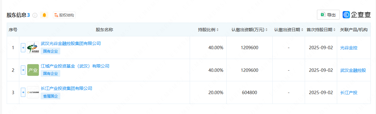 查詢發現,湖北長晟三期投資發展有限責任公司成立於2025年9月2日,僅比長存三期早了3天,註冊資本151.2億,股東為武漢光谷金融控股集團有限公司、江城產業投資基金(武漢)有限公司、長江產業投資集團有限公司。