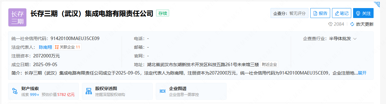企查查顯示,9月5日,長存三期(武漢)集成電路有限責任公司成立,註冊資本207.2億元,長江存儲董事長陳南翔任法定代表人。長存三期經營範圍包括集成電路製造、集成電路銷售、集成電路設計、集成電路芯片及產品銷售等。這是自2021年成立長存二期公司後,長江存儲又一次大動作。