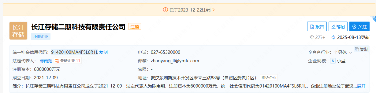 觀察者網注意到,此前長江存儲曾於2021年成立長江存儲二期科技有限責任公司,但該公司已於2023年12月註銷。相關信息顯示,長存二期的註冊資本高達600億元,除了湖北長晟發展有限責任公司外,國家集成電路產業投資基金二期股份有限公司(“國家大基金二期”)也位股東之列。